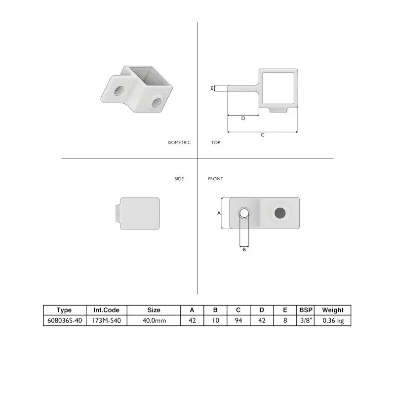 Short T-piece - 40 mm. Forms a perpendicular connection between two tubes. Upper fitting for straight, horizontal railing supports. This fitting can not be used for horizontal tube connections in the fitting itself.