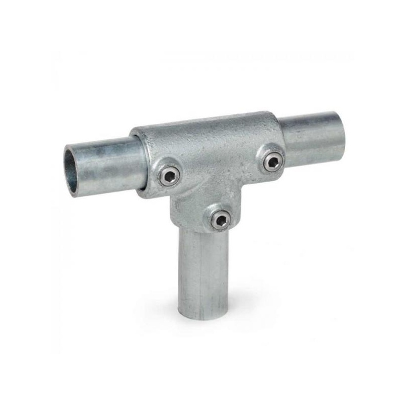 Short T-clamp 45°. Connects horizontal and vertical pipes at a 45° angle. The clamp is made of hot-dip galvanized malleable iron, durable, corrosion-resistant and long-lasting. Meets TÜV requirements.